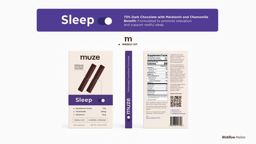 Muze initiated a comprehensive brand renewal focused on two pillars: A full update of its visual identity, improving clarity, shelf impact, and brand cohesion. The development of a new line of value-added functional chocolate products, formulated with natural ingredients designed to support sleep, focus, relaxation, and vitality. This positioned the brand at the intersection of indulgence, health, and purposeful consumption.