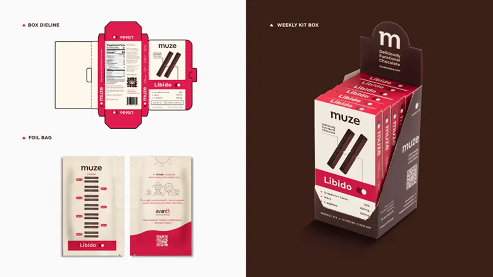 Through a strategic brand and packaging renewal, Muze strengthened its presence in an increasingly competitive market. The updated identity, combined with an innovative functional product line, positions the company as a modern, purpose-driven chocolate brand that blends indulgence, wellness, and social impact. The redesign not only enhances shelf visibility and communication but also opens new pathways for growth within the booming dietary supplement category.